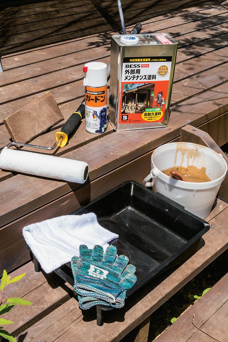 今回行うのは木材の再塗装。保護用の塗料を塗ることで、木の耐候性が高まり、寿命がぐんと延びるのだ。再塗装メンテの頻度の目安は、約5~10年(敷地条件による)。では、いざチャレンジ!