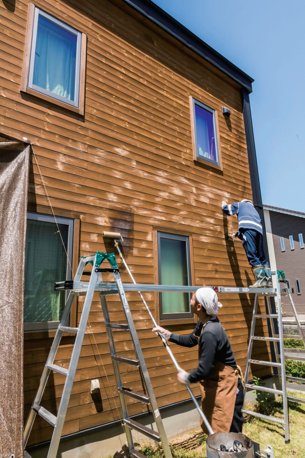 本日のメイン作業。低所部分は刷毛で、高所はローラーを使って丁寧に塗っていく。おすすめは2度塗り。仕上がりも綺麗で、耐候性も高まる。