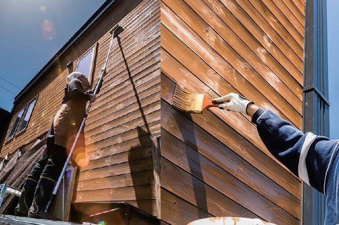 使用するのは「BESS外部用メンテナンス塗料」(「BESS」ではオリジナルで開発した含浸塗料も販売している。写真とは異なる)。木の通気性を妨げない含浸タイプの塗料だ。