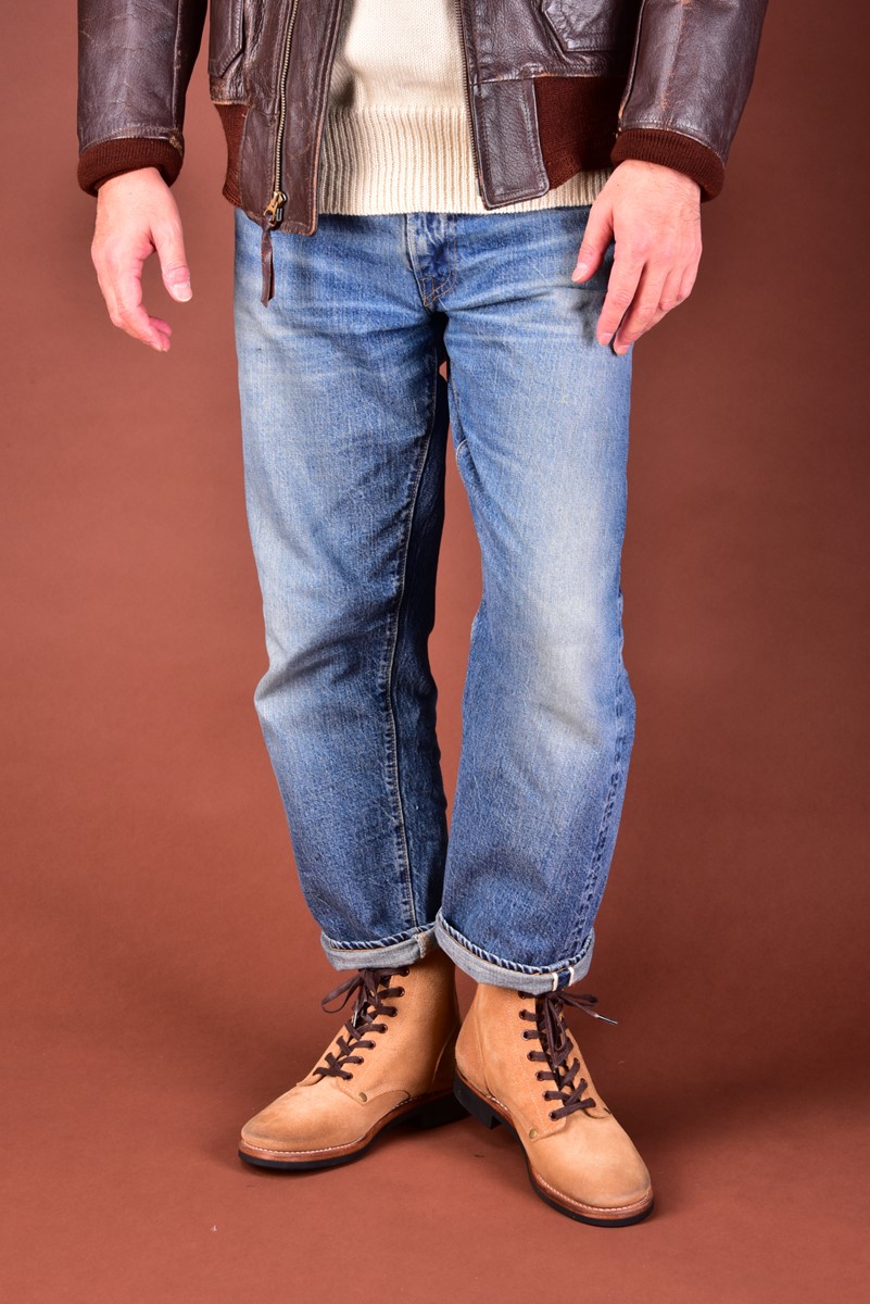 そもそも万能パンツとして知られる色落ちしたジーンズならば、スウェードブーツもすんなりとマッチ。軍モノながらスマートなデザインのため、大人っぽい印象もプラスできる。さらにフライトジャケットと合わせれば映画『大脱走』のオマージュスタイルの完成だがインナーをウールニットにすることで、こなれた感じを演出。