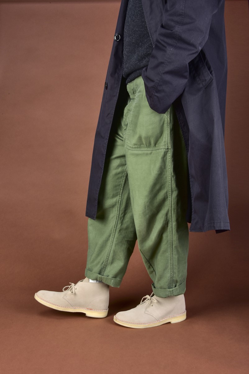 チャッカブーツタイプのスウェードは、ワイドやスリムといったどんなシルエットのパンツにも合わせられる真の万能選手。ご存知「クラークス」のデザートブーツならば、ドレスとカジュアルのイメージを両立しているため、コーディネイトのようなミリタリーパンツが持つ男くささを程よく中和してくれる。