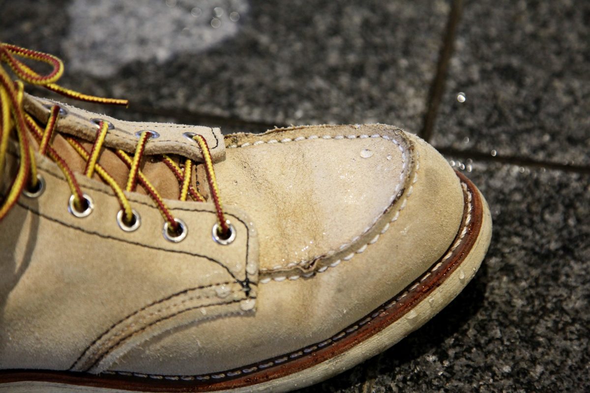 このレッド・ウィングの#8173は、私が約5年間着用しているもの。とりわけ雨の日は、コイツの出動率が非常に高い。にも関わらず、こんなに黒ずんだ汚れが少ないのは、紛れもなく防水スプレーのおかげだ。ブラッシングもたま〜に行うくらいで、決してマメにはやっていない。
