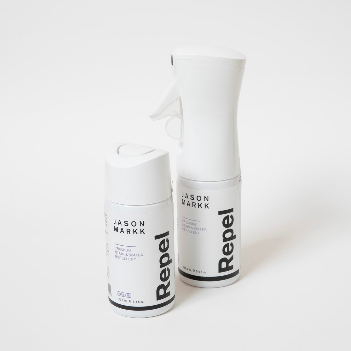 水性でスウェード、ヌバック、レザー、ナイロン、キャンバスなど吸水性のある素材であれば何にでも使えるのが魅力のレペルスプレー。2200円(ローテックスTEL03-6438-9558)