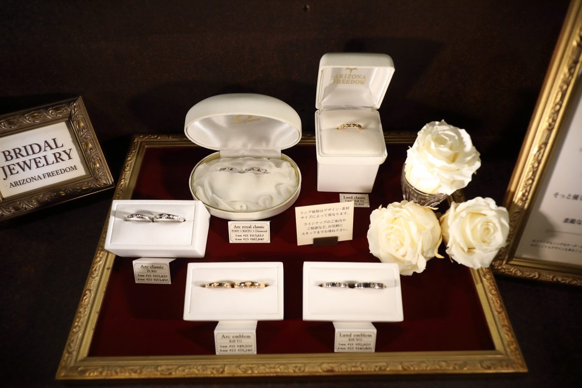 直営店同様、シンプルなデザインのブライダルリングの取り扱いも。素材もシルバーはもちろんダイヤ入りやゴールド、さらにはカスタムオーダーにも対応しているのは嬉しい。
