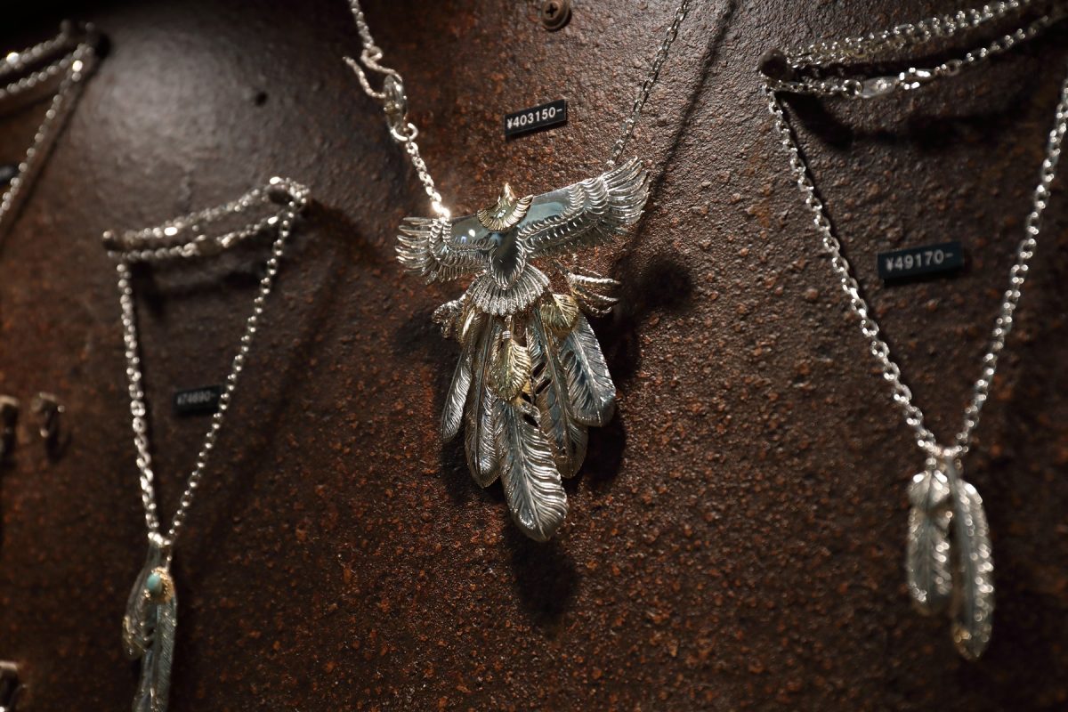 フェザー、アラベスクと並び創業時から作り続けているイーグルのペンダント。フェザーを重ね着けすることで、オリジナリティを演出できるのも楽しみ方のひとつ。