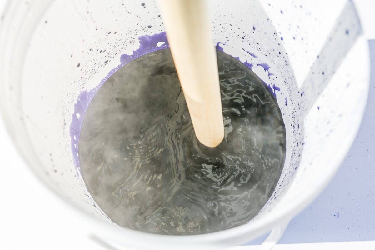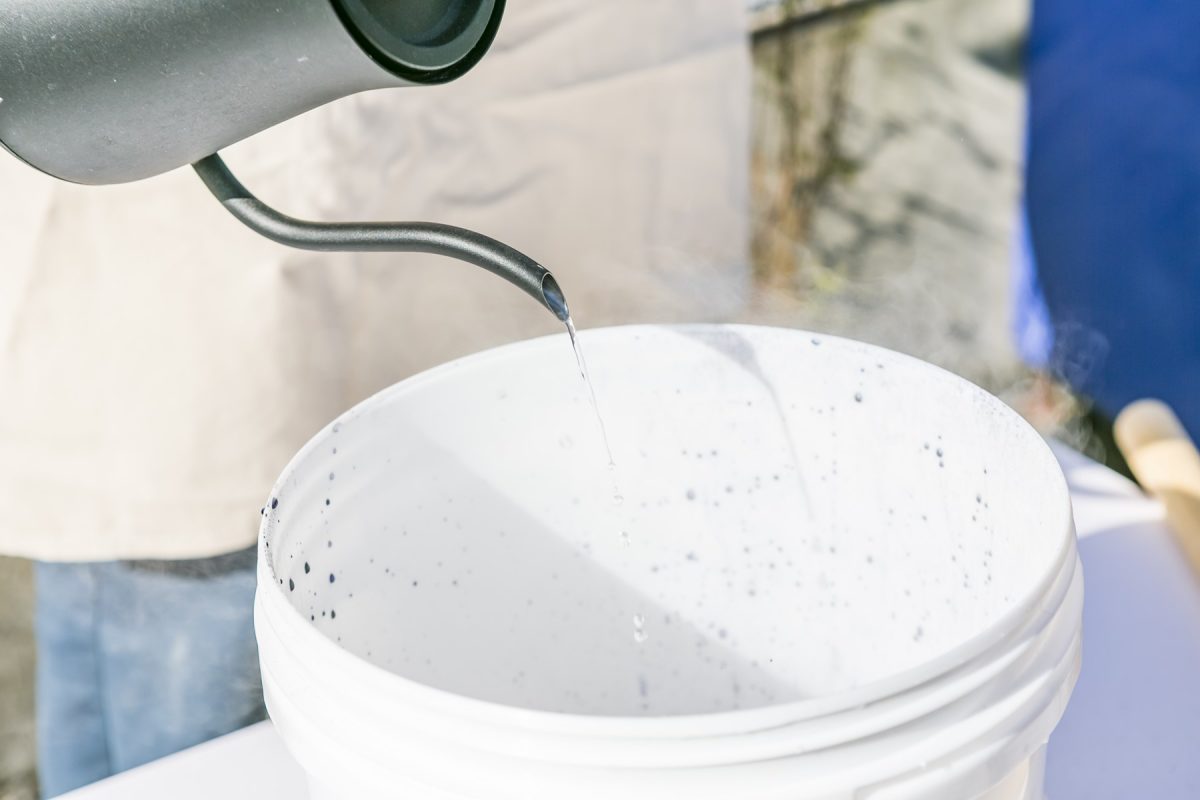 次に染料を作る。バケツや桶に染料をエコバッグ3枚に対して10g(容器の半分)入れ、500㎖の熱湯、さらに3.5ℓのぬるま湯を加えてよく混ぜ合わせる。