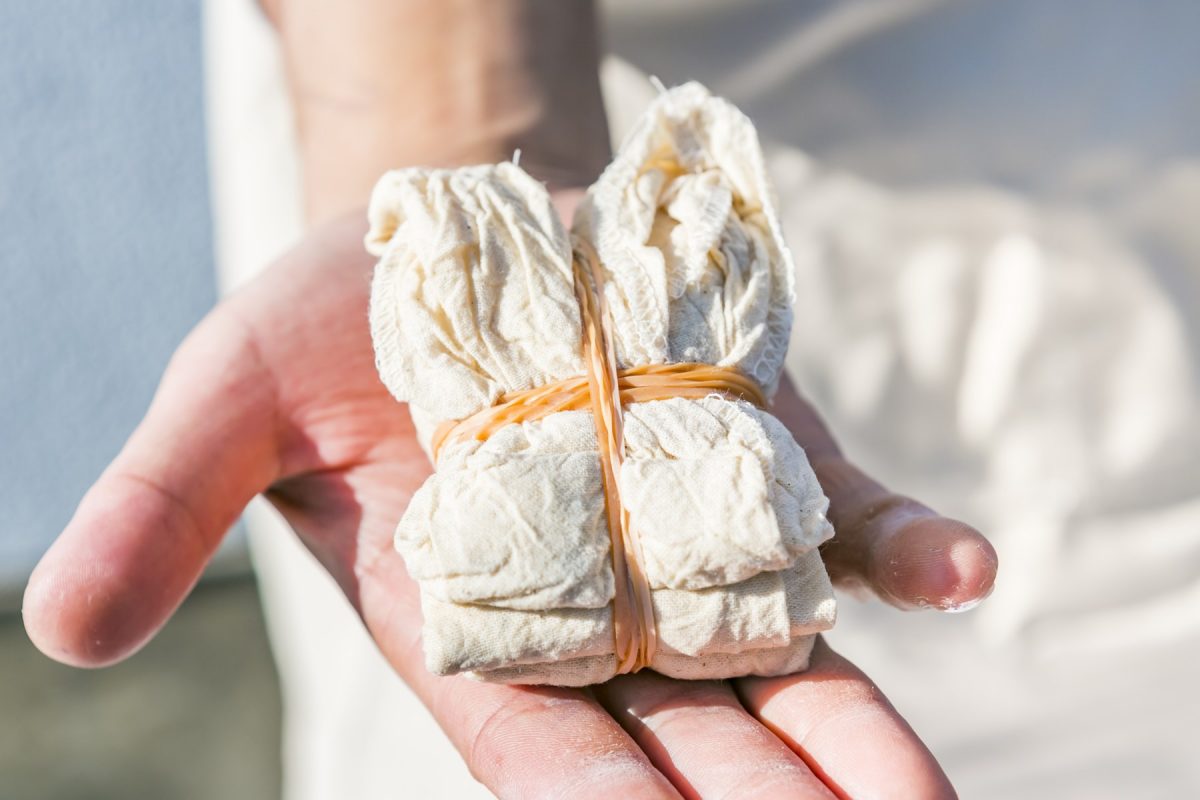 よく絞って乾かせば完成! 染色のときに布が重なりあった部分は染まらないので、2つとない模様が出来上がる。