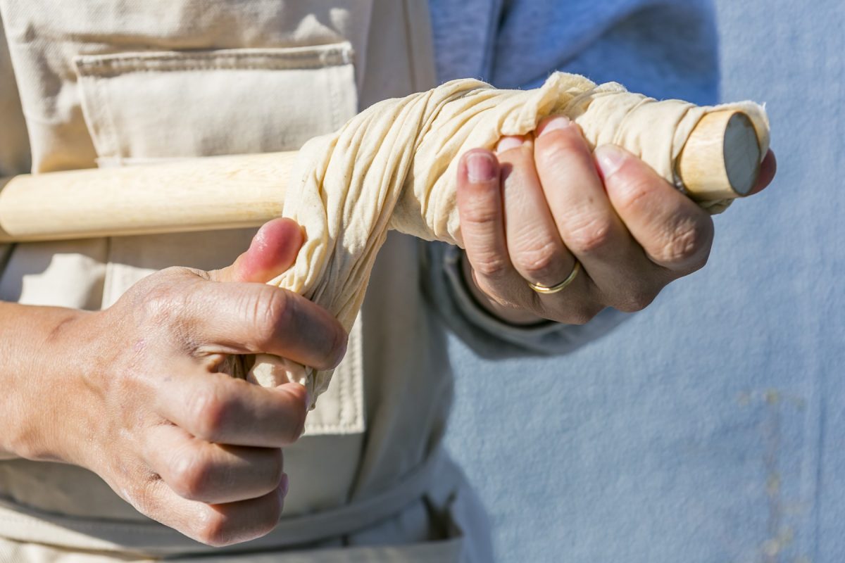 染めるときに布を巻き付けるための丸棒。所々流線的な模様ができる。今回使用したのは直径5㎝の少し太めのもの。約100円