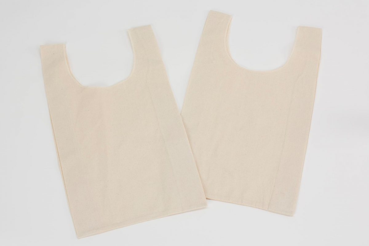 ナチュラルまたはホワイトの無地のエコバッグを必要な枚数を用意。キャンバス以外でもざっくりした布が◎。1枚約400円