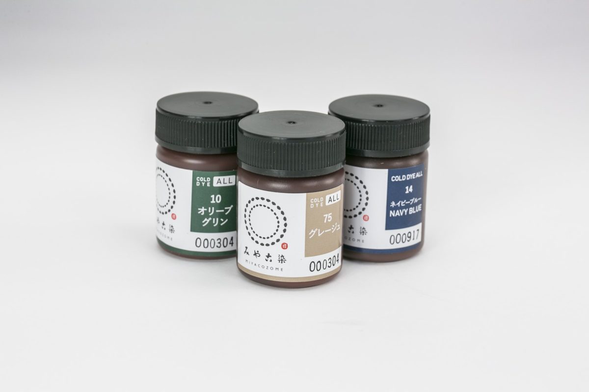 今回使用したのは「みやこ染」のコールダイオールタイプ。普通の布のほかにもウールやナイロン、絹などを染めることもできる。約550円(20g)