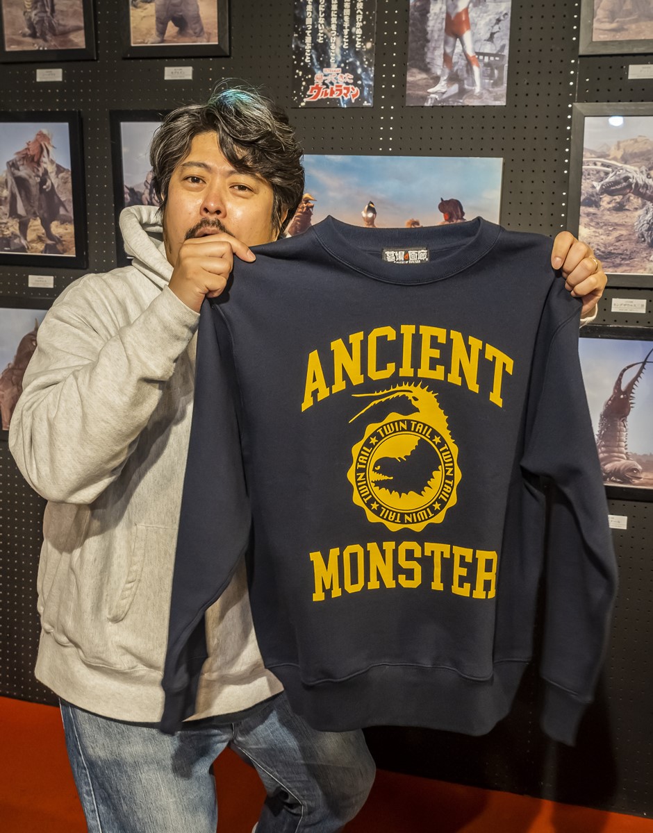 ネイビーのボディにカレッジ風のロゴが映えるクルーネックスウェット。これは『帰ってきたウルトラマン』に登場した怪獣「ツインテール」をデザインしたもの。5800円+税