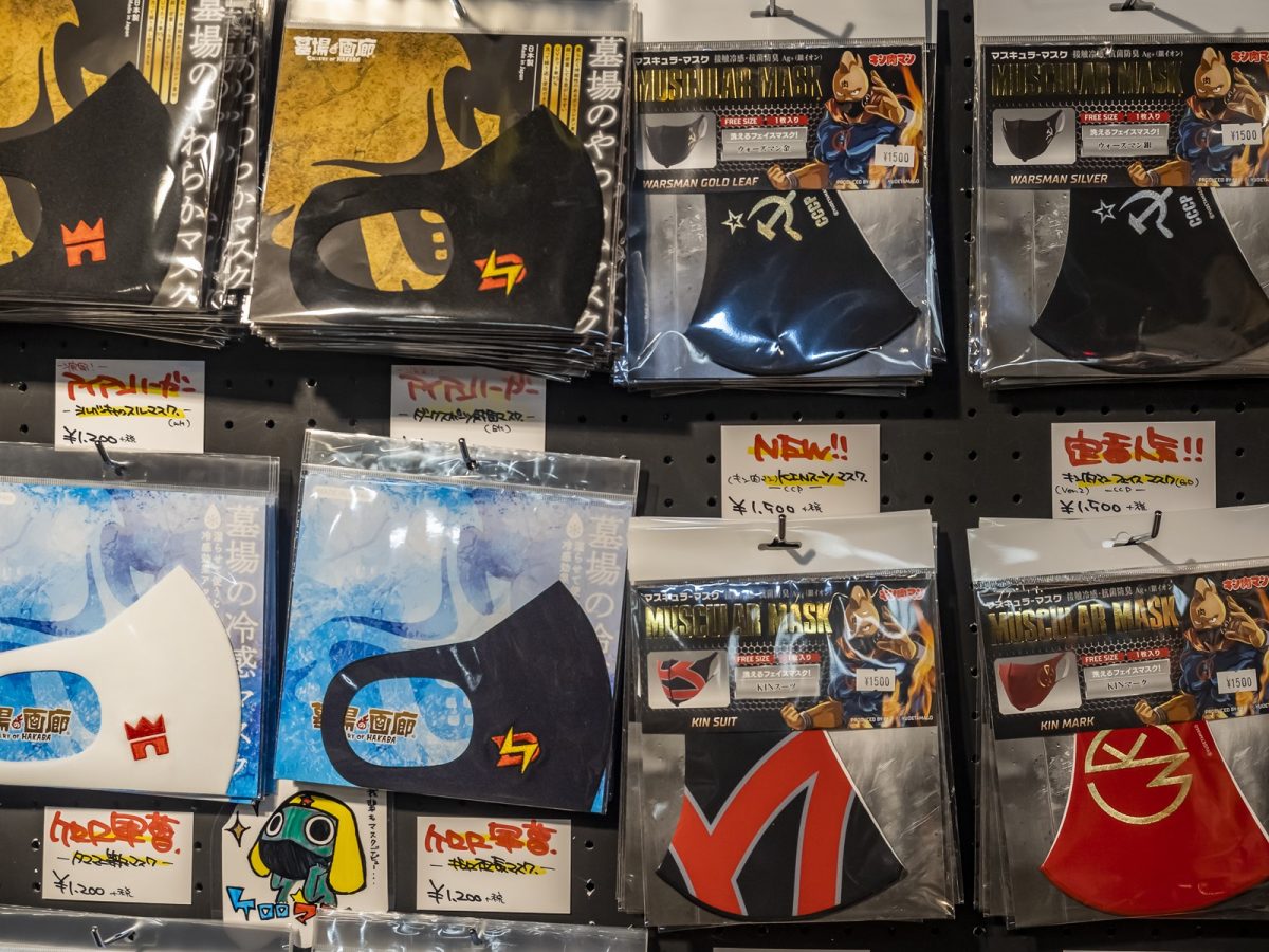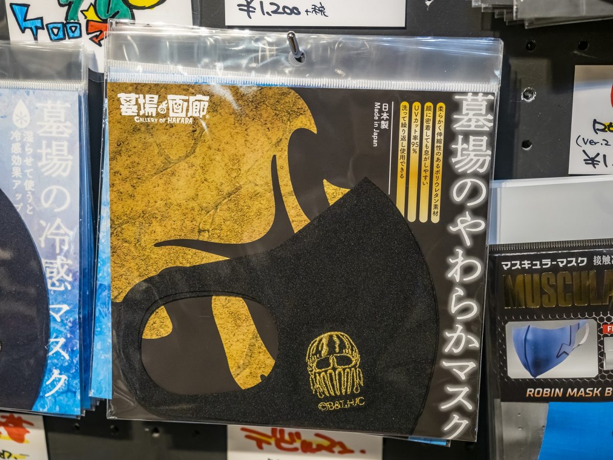 いまやマスクは生活必需品のひとつ。同店でも墓場の画廊オリジナルマスクだけでなく、CCP社製のキン肉マンのマスクなど様々なキャラクターのマスクを取り扱っている。注目は北斗の拳に登場した「ジャギ」マスク。墓場の画廊イチオシの人気商品だ。