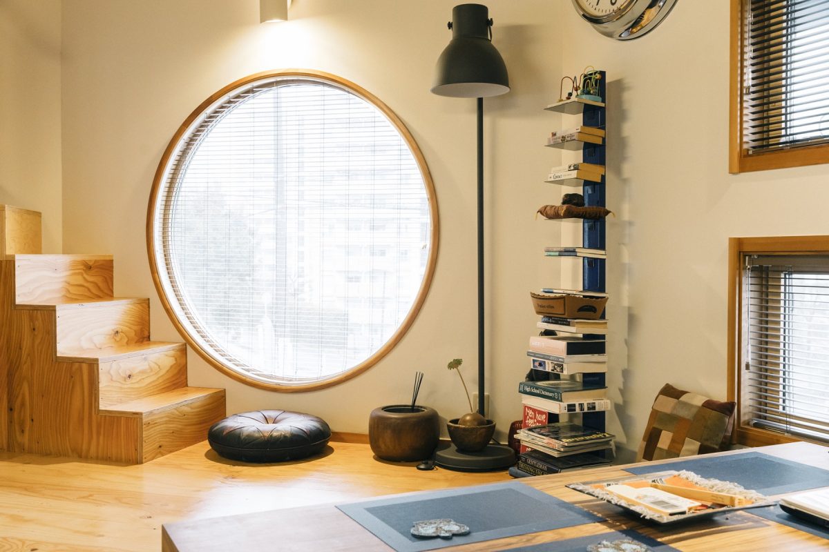 和のテイストを感じられる丸い窓は、外観のアクセントにもなっている。リビングから1段上がっているスペースにあるので、より存在感があるのだ。