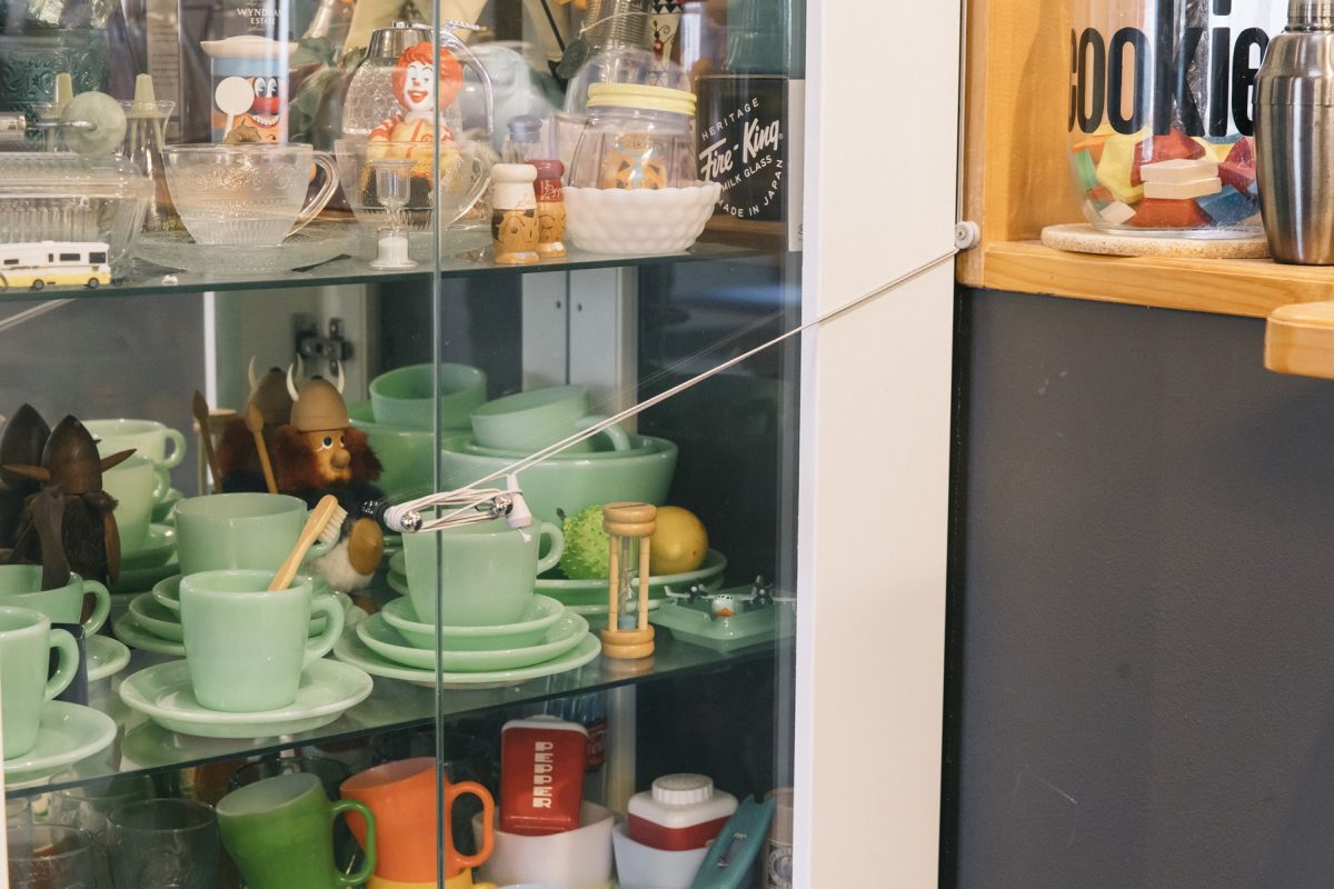 ファイヤーキングを中心にディスプレイされたガラスのショーケース。日々のライフスタイルで使っているキッチンウエアも、見た目にこだわれば立派なインテリアになる好例。