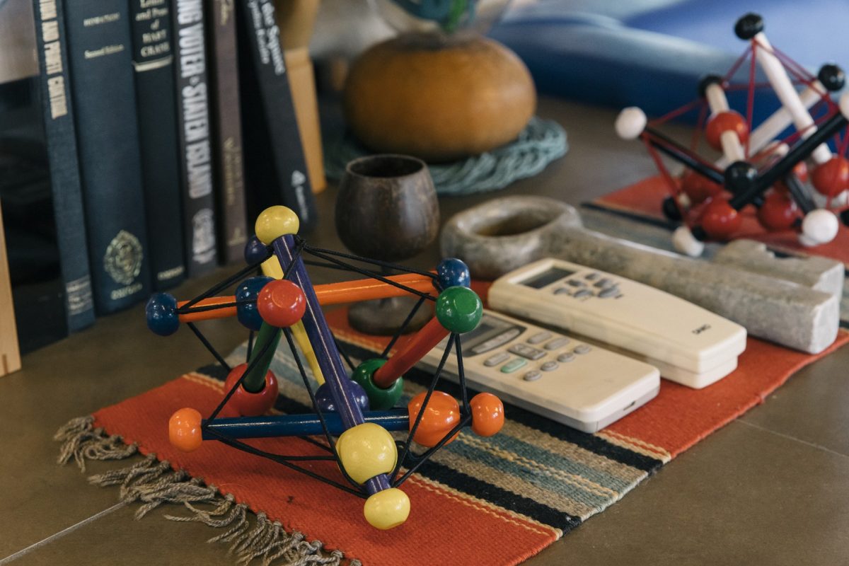 アメリカの伝統的な織物であるチマヨ織りの上には、ミッドセンチュリー期に流行したアトミックを思わせる小物をディスプレイしている。