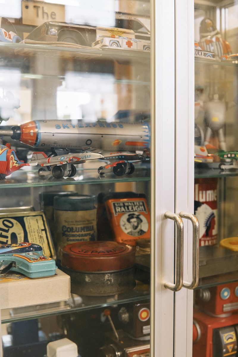 アメリカのアンティークトイなどを並べたガラスケース。収納を兼ねた魅せるディスプレイテクニックは、いくつものショップで培ってきた。