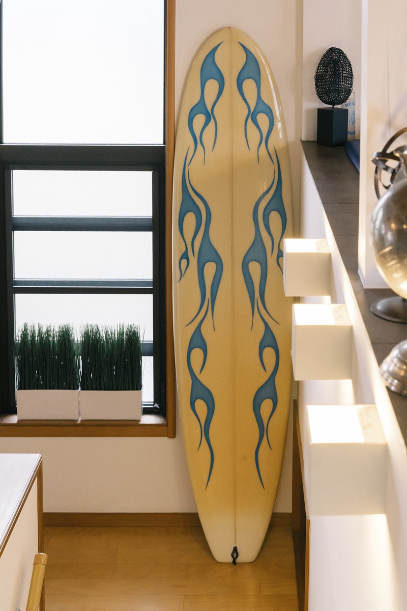 1階と2階を繋ぐ階段スペースは、かなり広くしており、このようにアートワークを施したサーフボードを飾っている。愛犬のスペースもここにある。