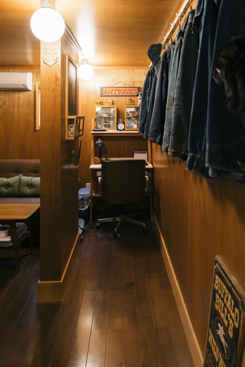 ただ内装はすべて手を入れていて、二階はリビングと和室のロフト、一階は書斎と寝室とガレージとかなりシンプル。ショップの内装も多く手掛けてきたので、自分の好きなものを詰め込んだ感じですね。ヴィンテージもあれば、寸法に合わせたオーダー家具もあり、ミッドセンチュリーや北欧、和物などを自分の感覚でミックスしています。