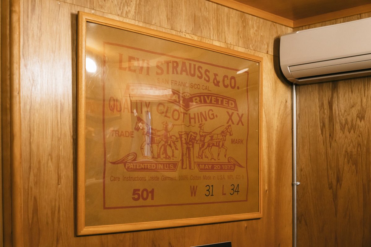 書斎スペースに飾ってあるリーバイスのアドバタイジング。実際の紙パッチと同じ素材で、こんなに大きく作っているのが面白いのだ。