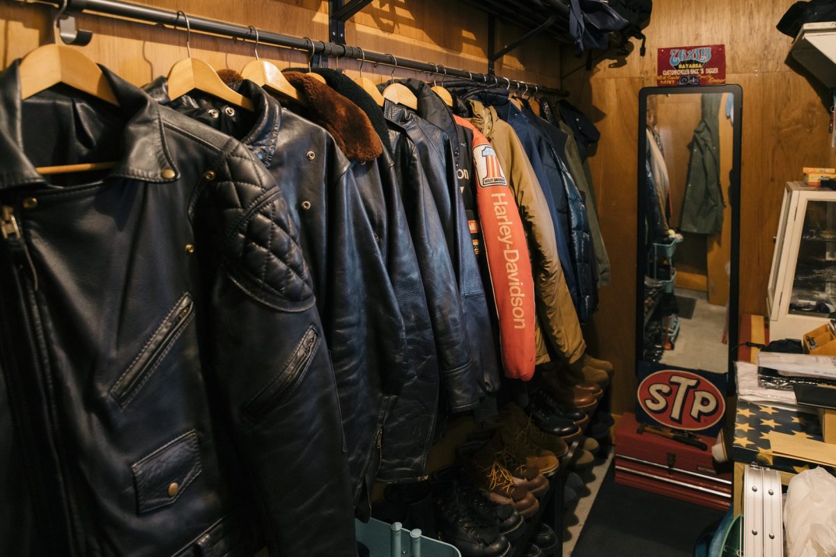 ヴィンテージのハーレーを複数台所有する和歌さんのワードローブが収納されているスペース。レアなヴィンテージも多く、多くのモーターサイクルジャケットが並んでいた。