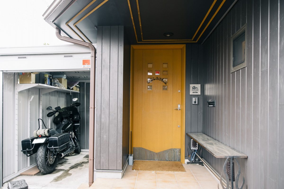 玄関スペースの横には、愛車を入れているガレージがある。現在は整備に出している車両もあるため、ここには1台のみ。ドア横のベンチもイイ!