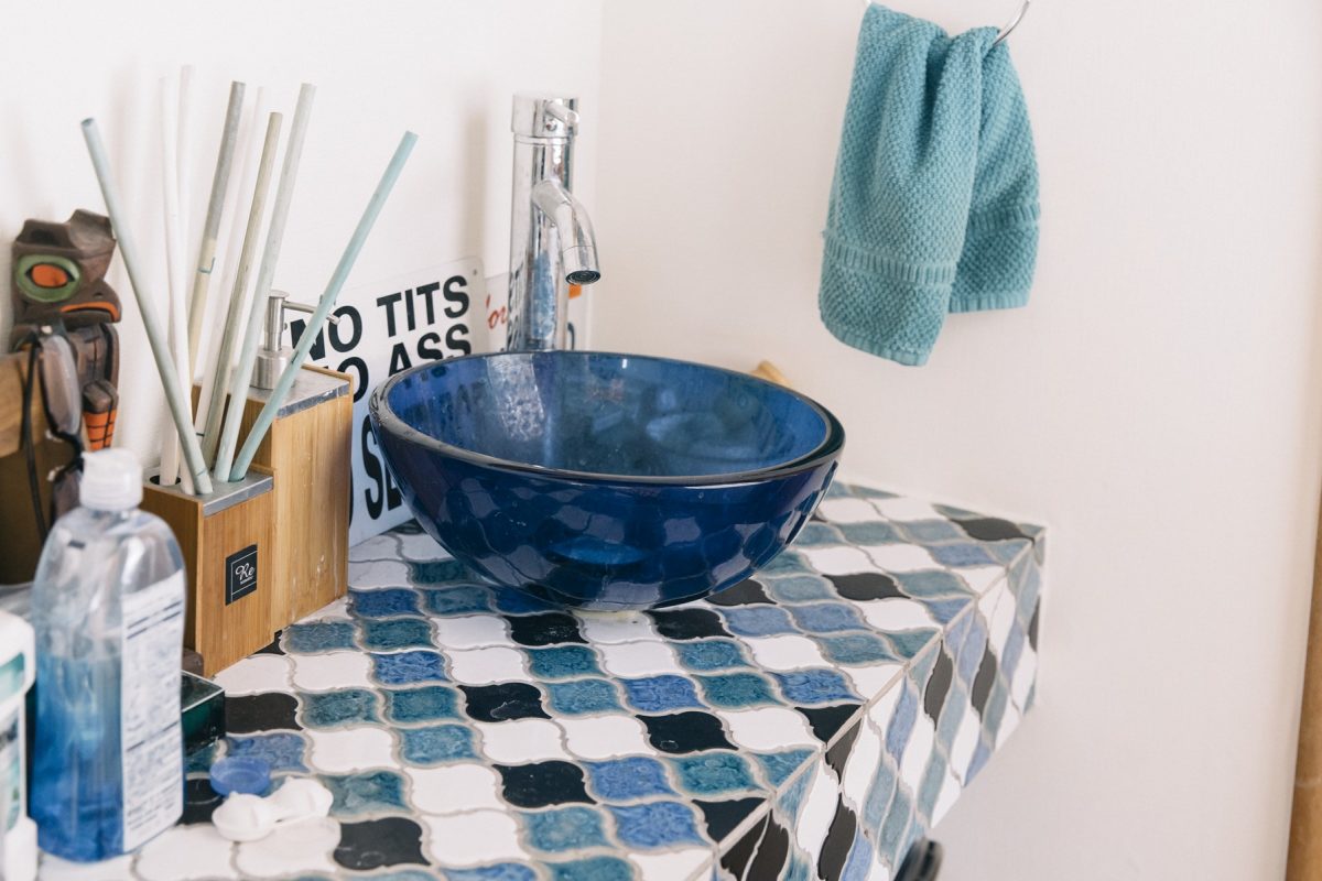 2階のレストルーム前にある洗面台は、クリーンなタイル使いが光っている。ブルーとホワイトで統一して海外のリゾートホテルのような雰囲気だ。