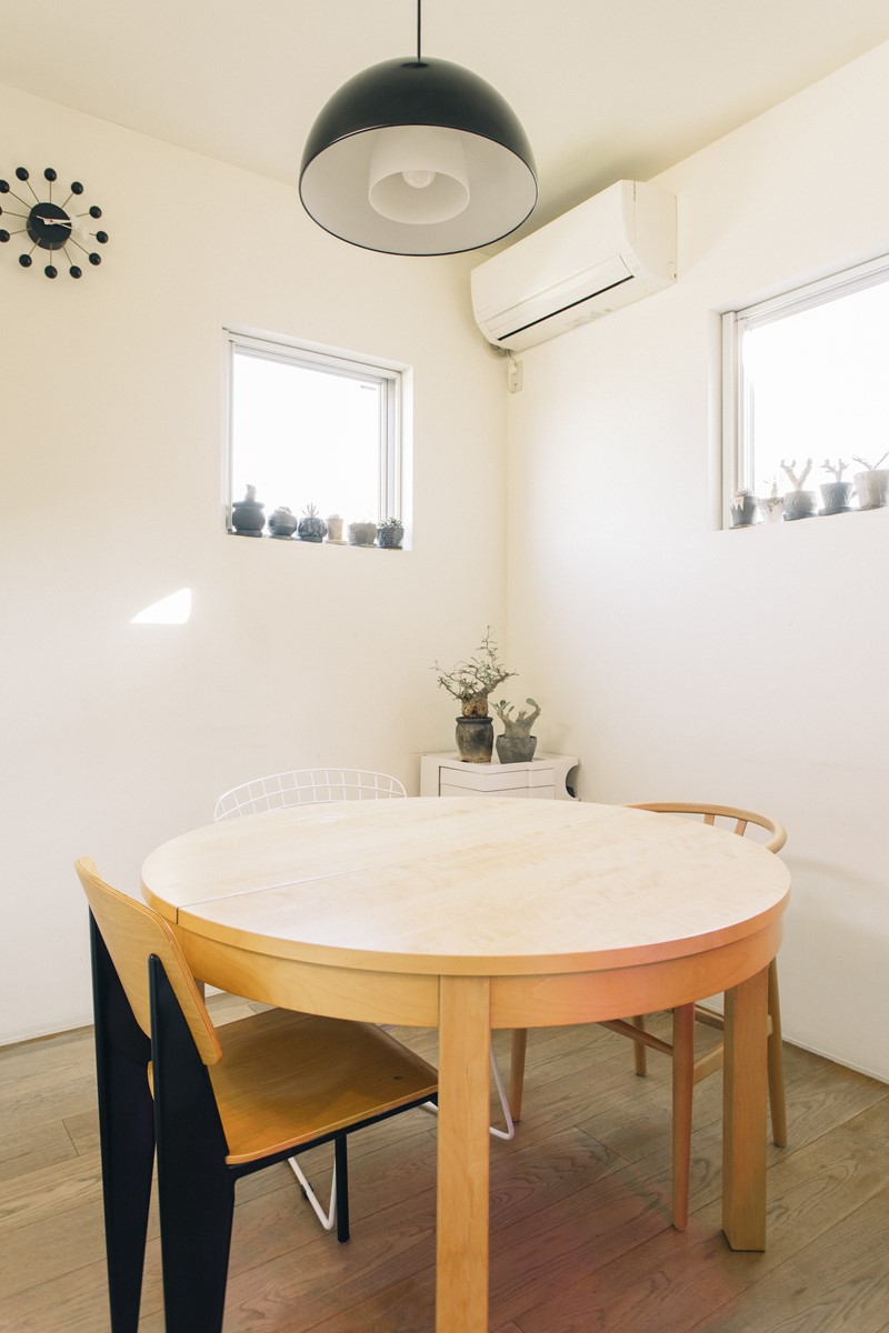 オープンキッチンの付いたダイニングスペースは、あえてダイニングチェアを統一していないのが好印象。レアな塊根植物がアクセント。