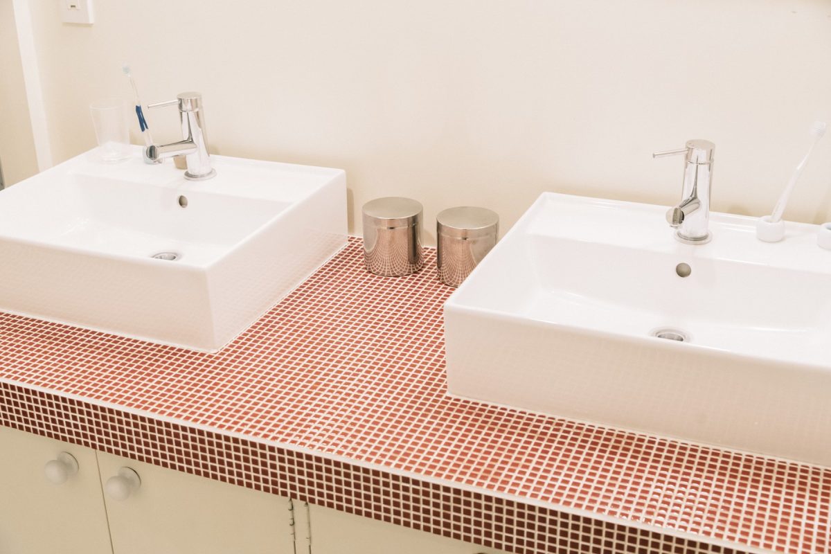 4人家族のため、シャワールームに併設する洗面台は2台用意。清潔感のあるタイル張りにしており、中嶋さんらしいセンスが光る。