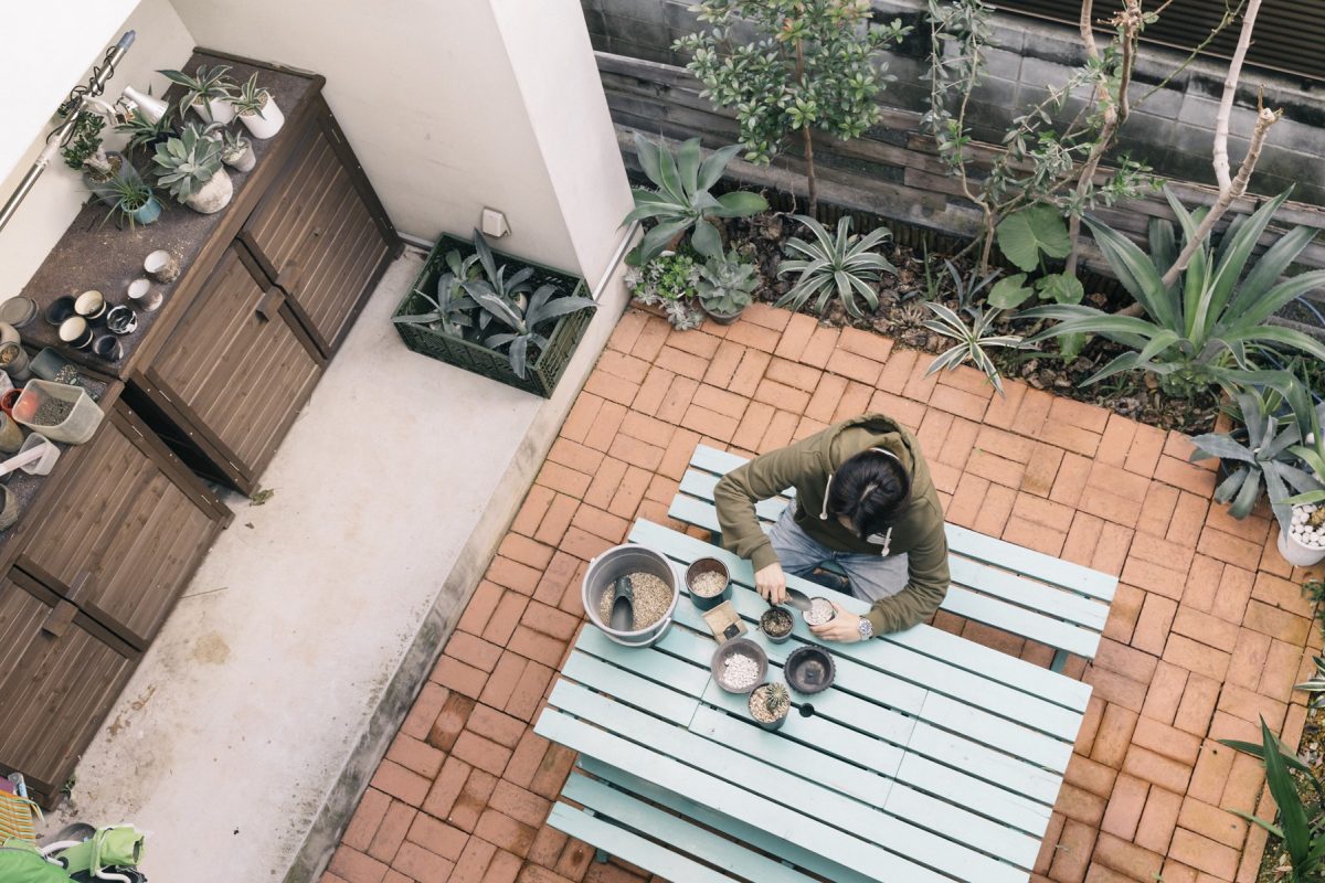 中庭スペースには複数のアガベが地植えされている。越冬できる品種をしっかりとチョイス。テーブルの上で、大好きな塊根植物を植え替えするのが最高の時間だそう。