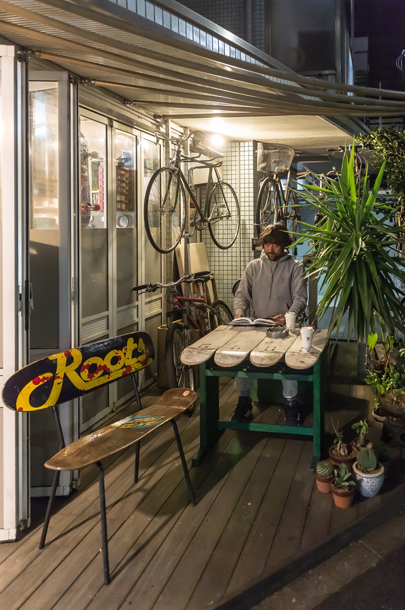 チルスペースとして活用しているのテラスのテーブルは、お客さんでもある友人のタクちゃんのデッキを繋ぎ合わせて製作。毎回真っ白のデッキに乗っていたため、その削れ方が芸術だと感じ、テーブルに応用することを思いついたそう。もちろん本人のサイン入り。