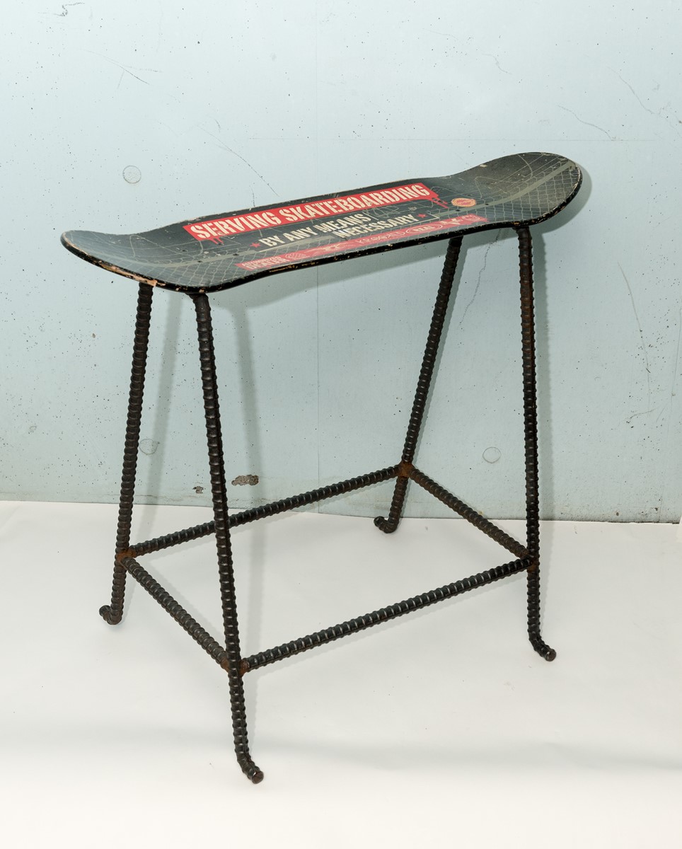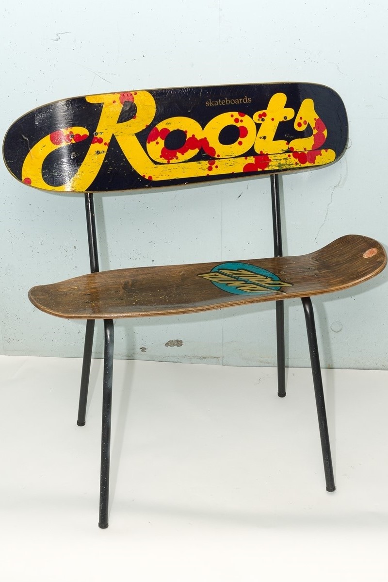 Rootsの初期型デッキと’80年代のSantacruz のヴィンテージデッキを組み合わせたスケートボードチェアは、常に古いものには触れていたいと製作、骨組みは市販されていたものだが、現在は販売されていない。