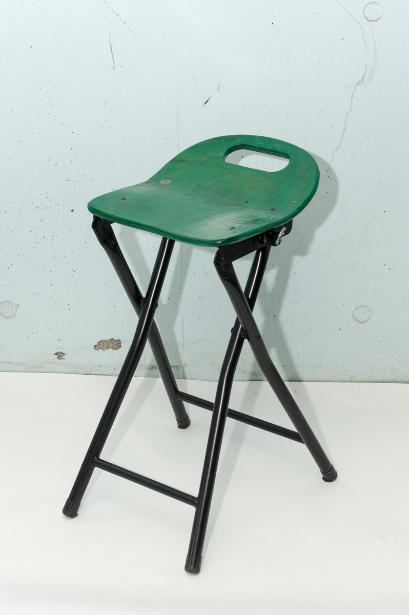 ホームセンターで偶然見つけた折りたたみ椅子の幅が、デッキサイズだっため加工して座面に取り付け。取っ手をつけたのは、カスタムビルドデッキを製作するWooden Toyの大場さん譲りとのこと。