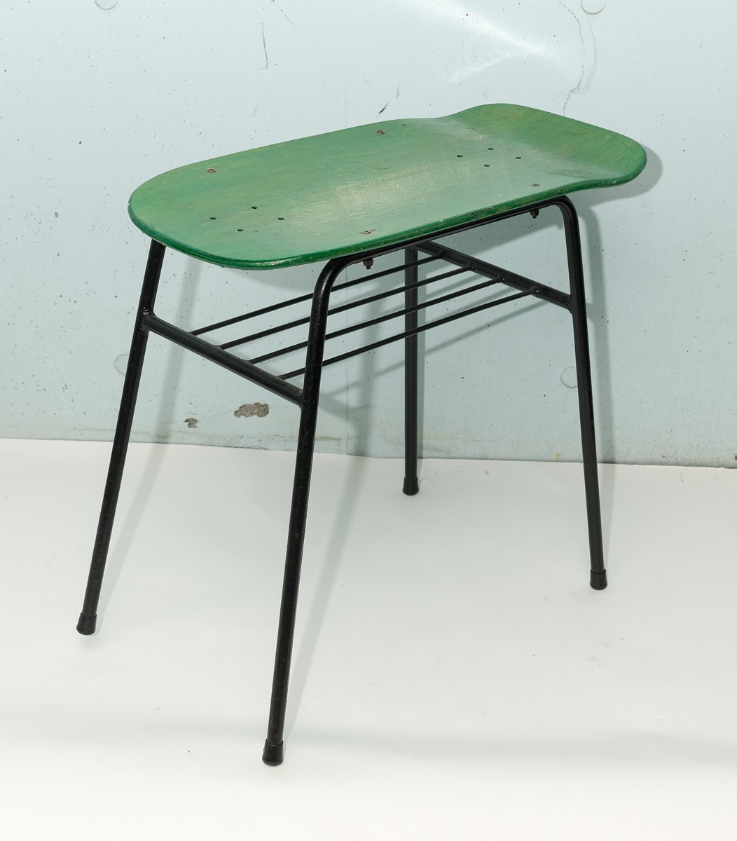 スケートボードの椅子が欲しいなと思いたち、すぐさまデッキを鉄筋の溶接加工場まで持っていき加工した思い出の逸品。デッキはSFの大手ディストリビューター、DLX社の記念モデル。