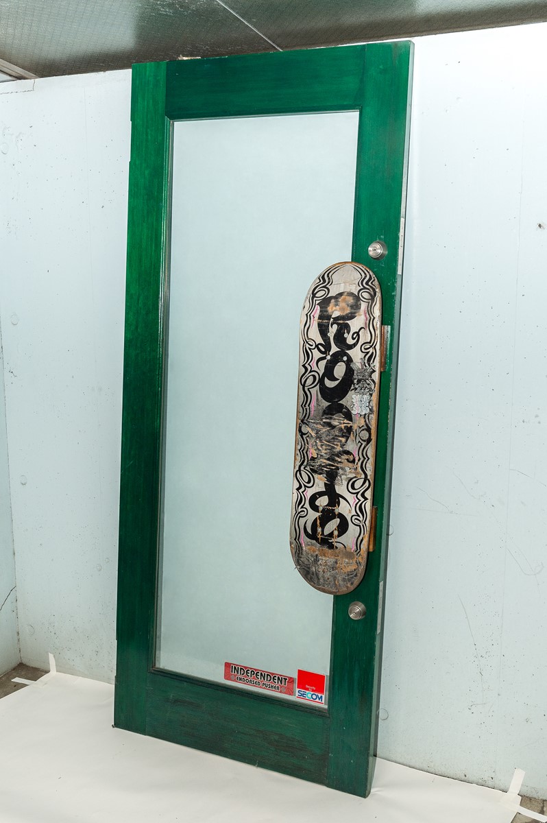 5050ライダーである小林幹夫さんが製作したドア。カレーさんが設計し、素地で収めてもらったものを塗装している。「5050」の2号目のお店のドアに使用していた。取っ手がデッキになっているところがポイントだ