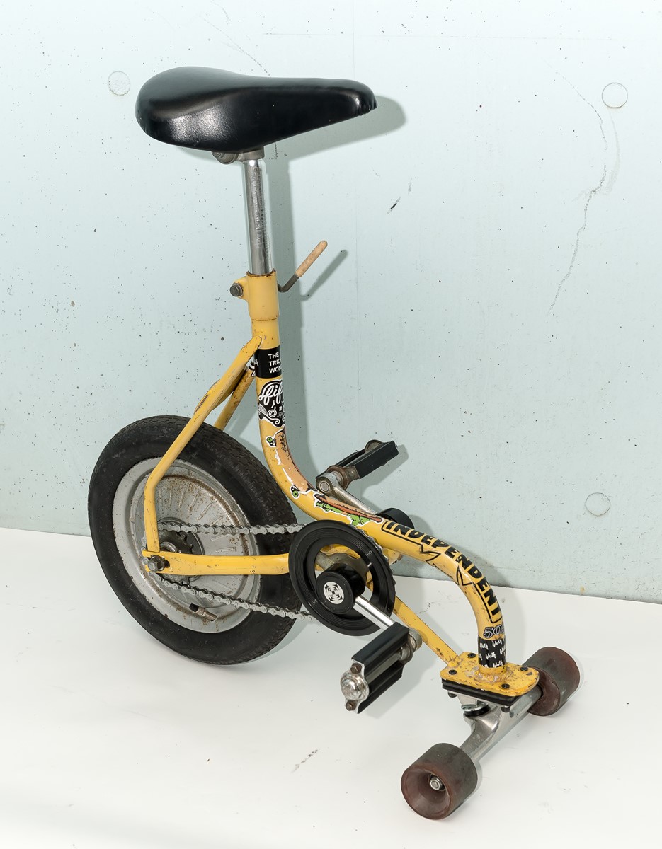 元はフジローラーサイクルのラックルという商品。古いものを偶然いただいたことを機にトラックをIndependentの215にチェンジ。ステッカーを貼ったりチェーンを替えたりしてレストアした。