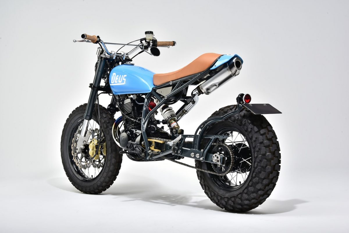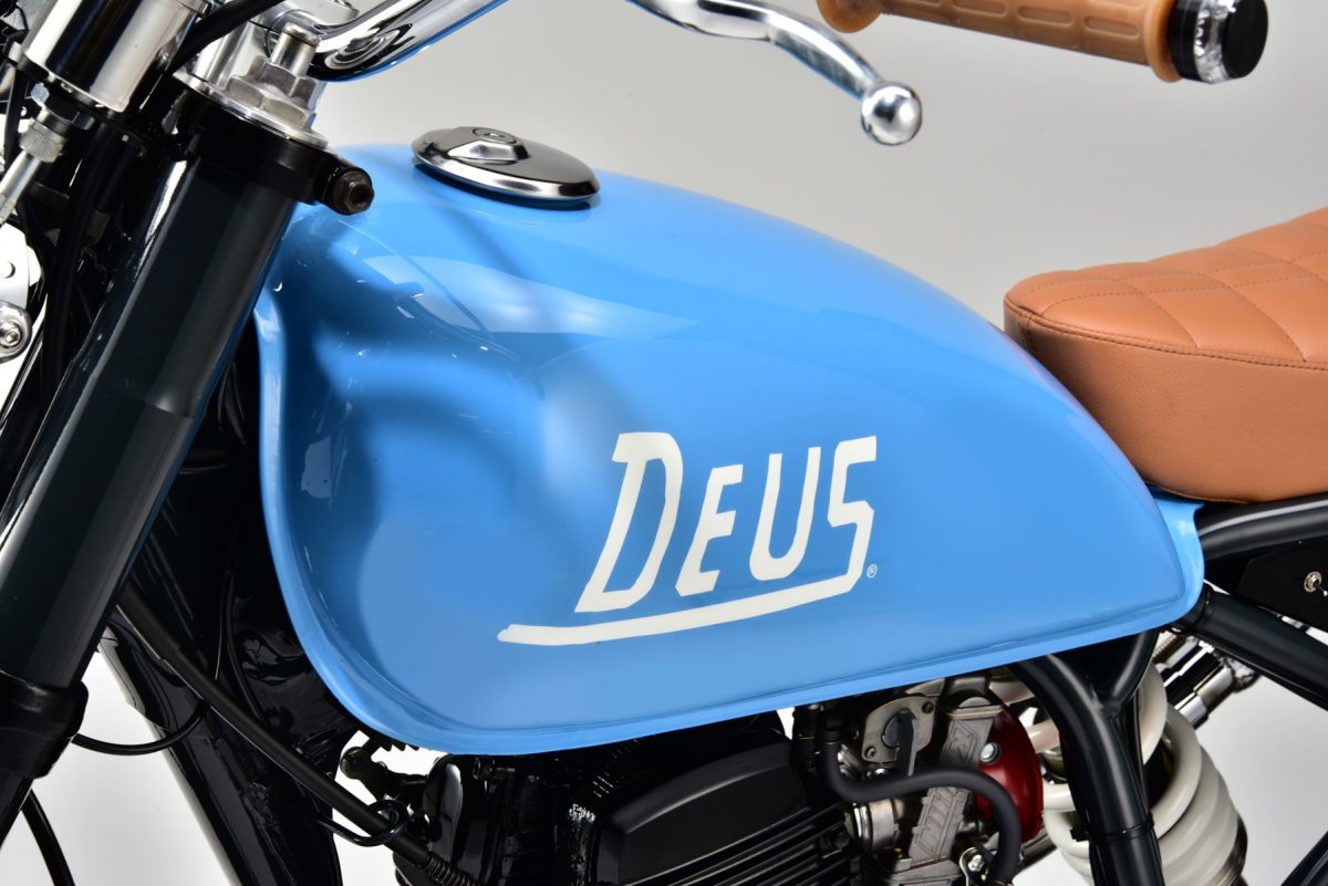 ライトブルーに塗装されたワンオフのタンクは’90年代を彷彿させる。中央にはデウスのロゴがあしらわれる。