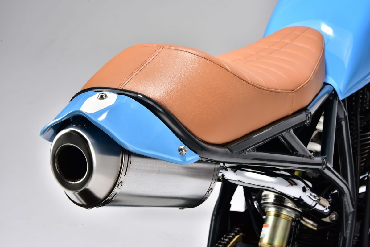 また大柄な英国人オーナーに合わせてシートフレームをトラス式で補強を入れたり、ナンバープレートステーも凝ったデザインを採用したりと、ワンオフにより作られたパーツもふんだんに盛り込まれているのも見どころなのだ。