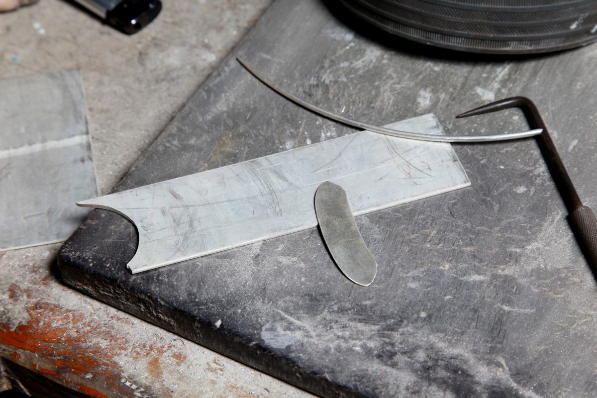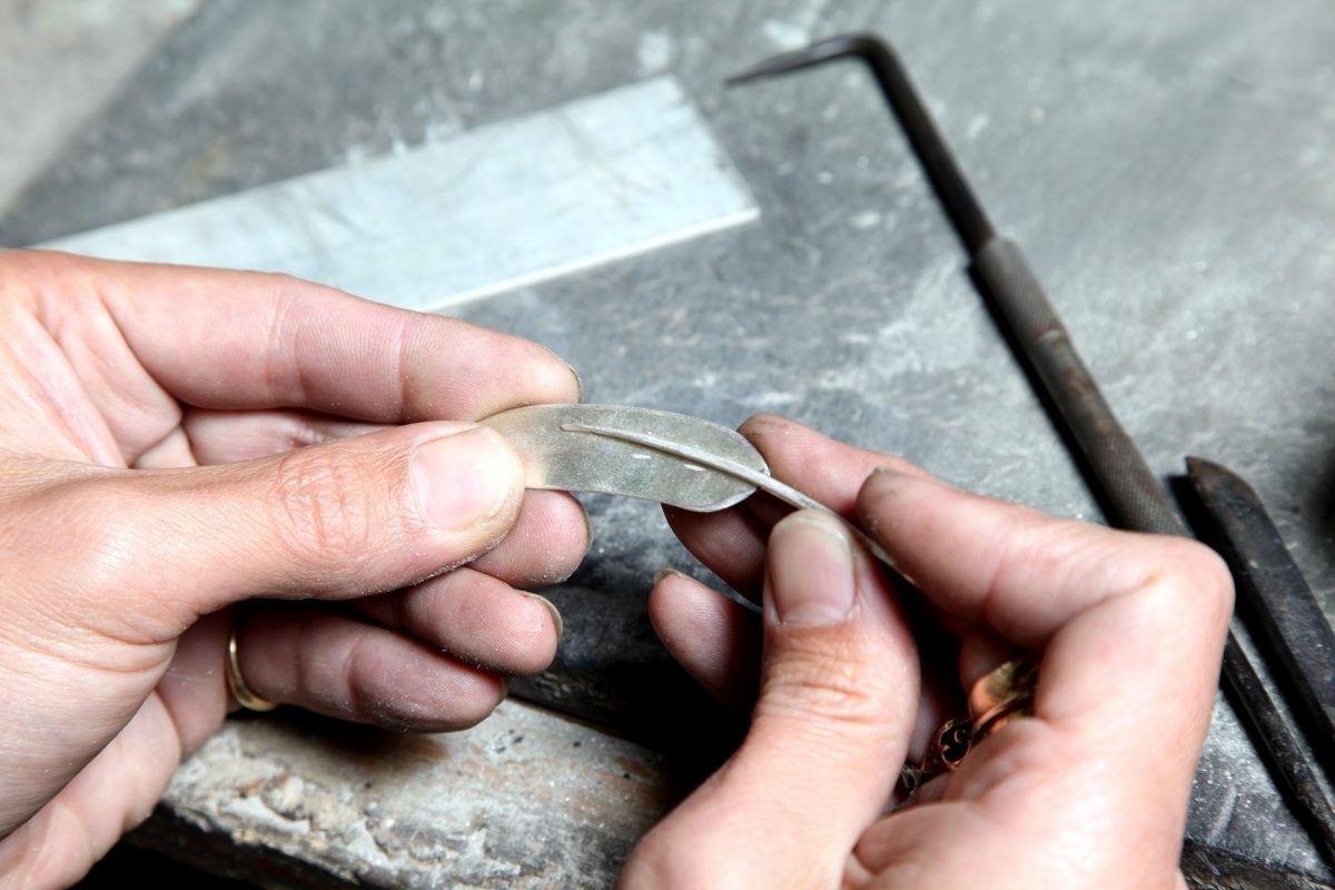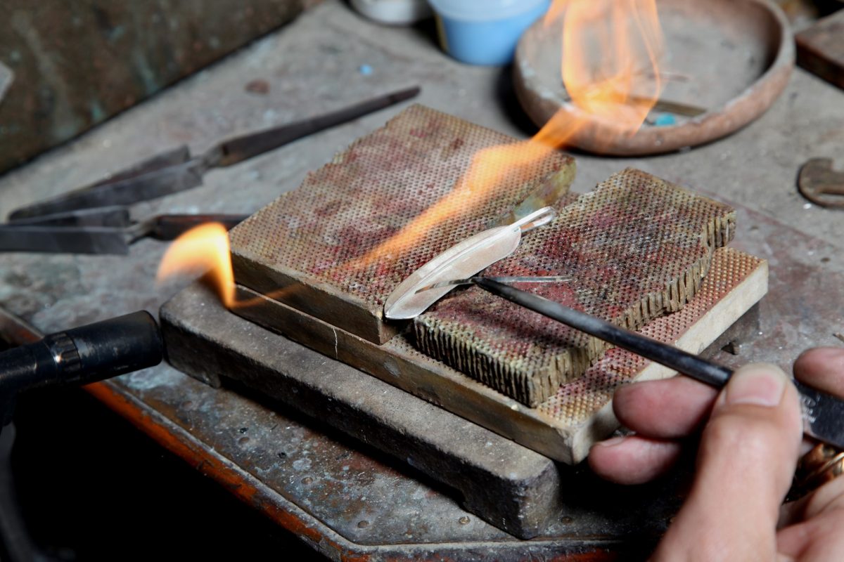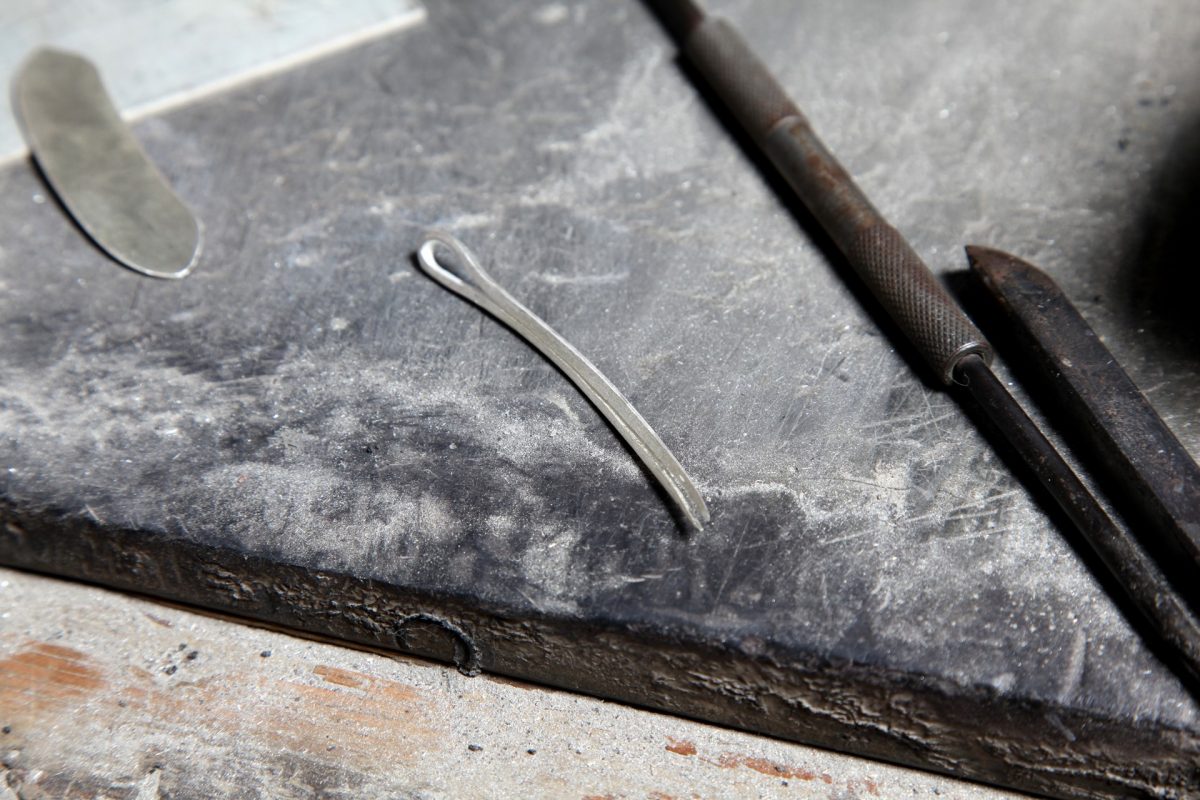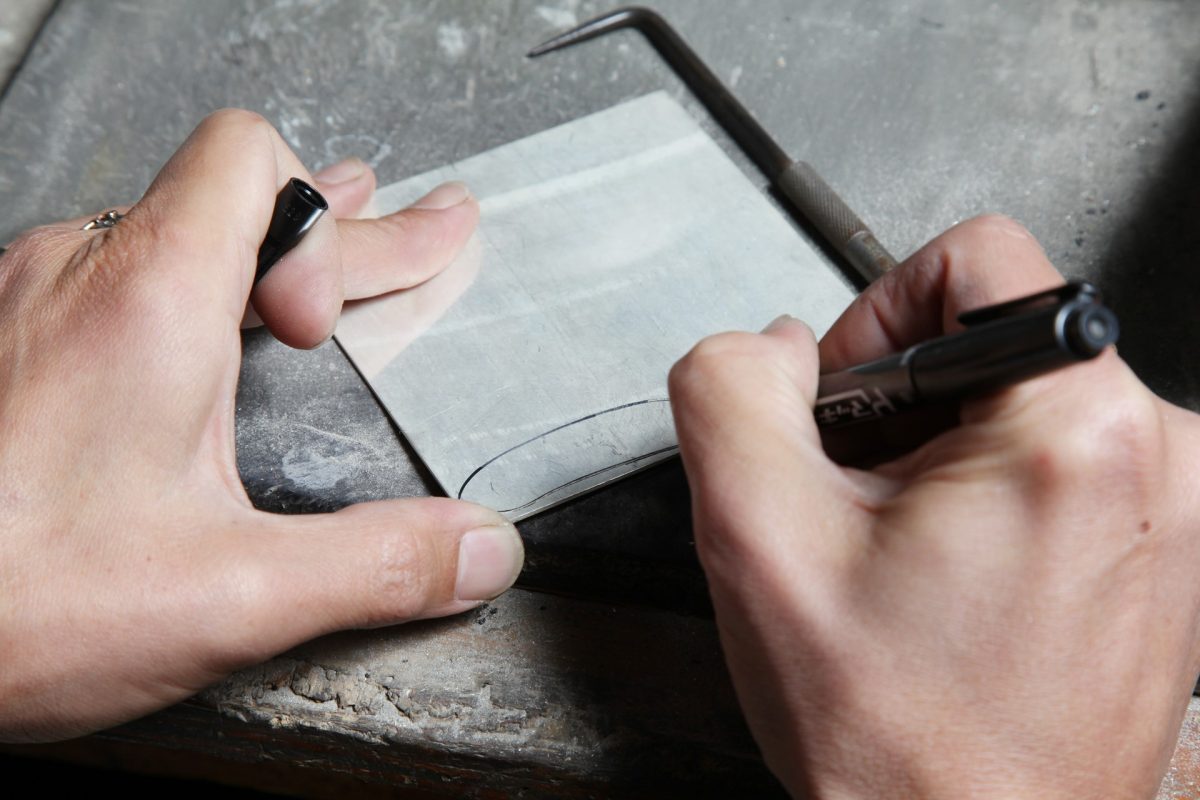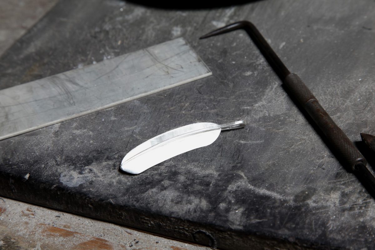 まずはシルバーの板に、フェザーの形を描いていく。素材に使用するのは5%の銅を含んだ銀合金「シルバー950」。美しい色味が特徴的だ。