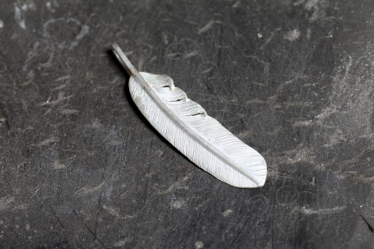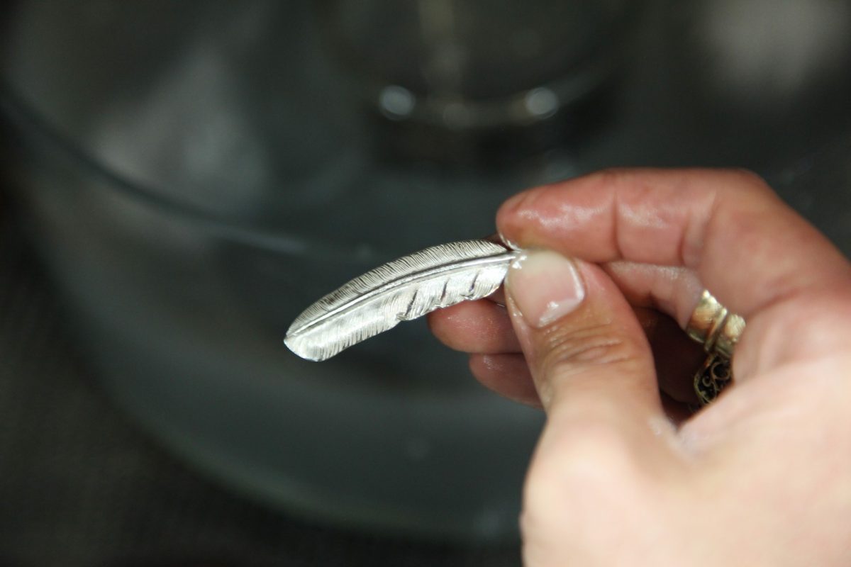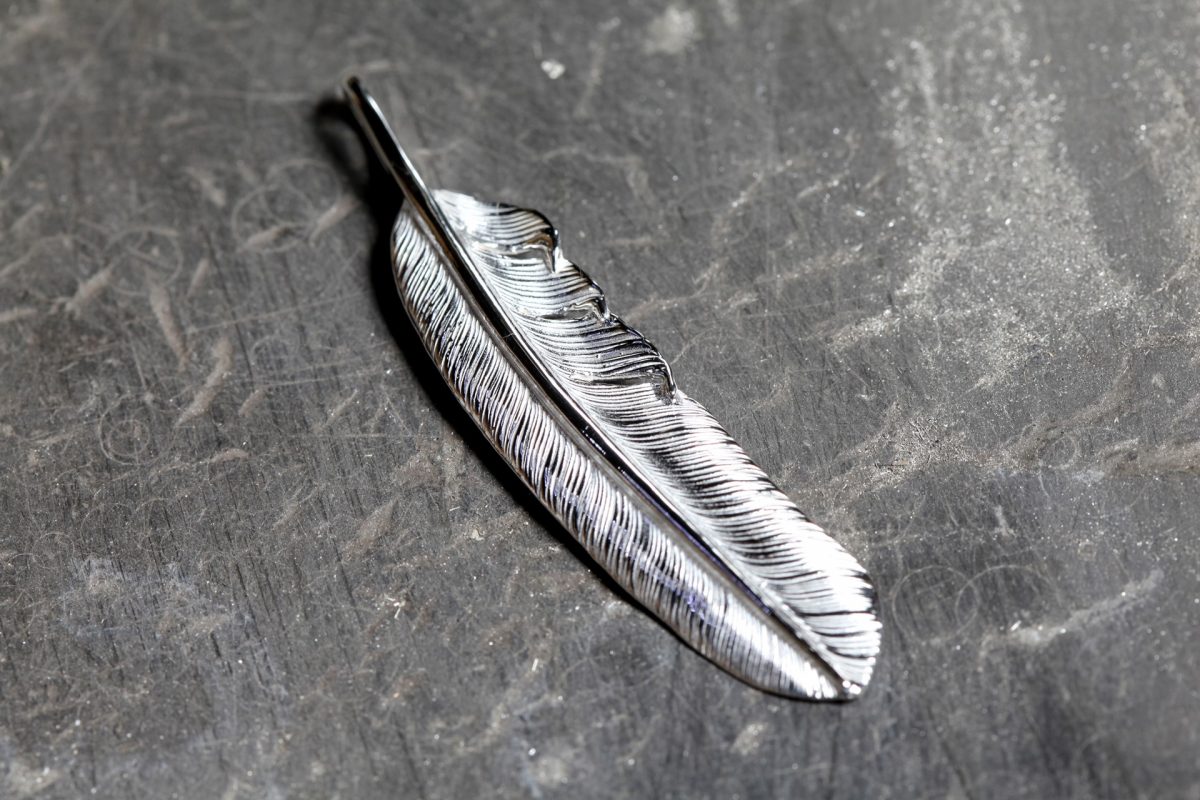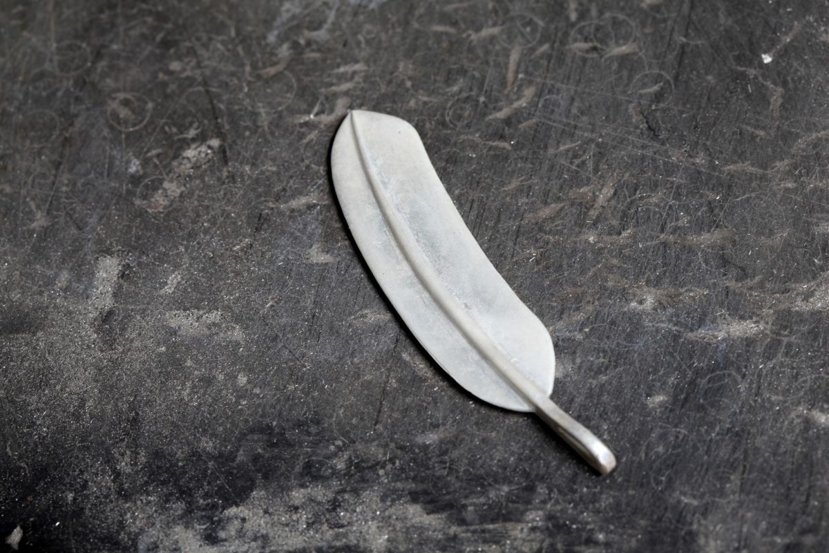 毛も彫り終わり、切り込みの立体感も出て、遂にフェザーのカタチが完成! あとはシルバーの輝きを加えるのみ。待ち遠しいぜ!