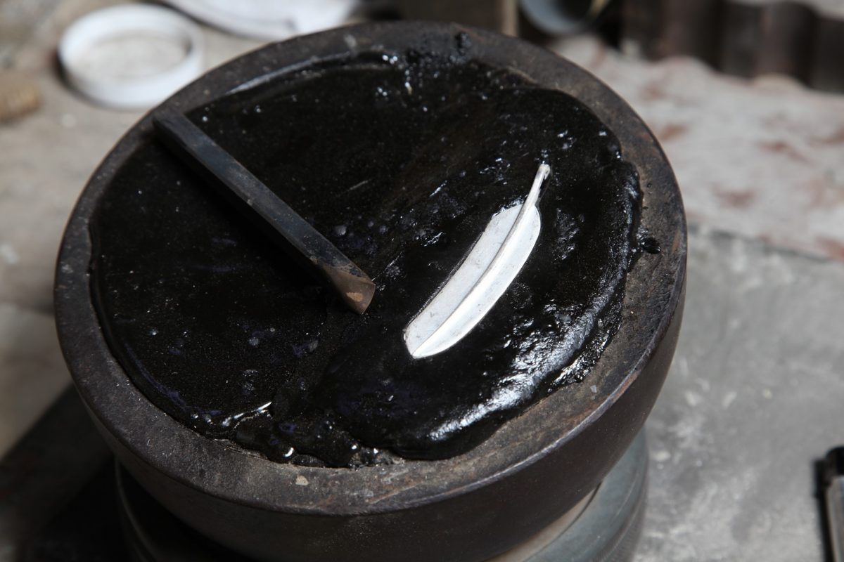 松ヤニで固めた作業台にフェザーをセットする。バーナーで松ヤニを熱し、軟らかくなったところにフェザーを埋め、固定する。