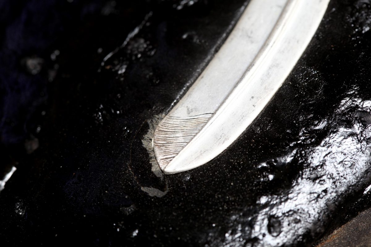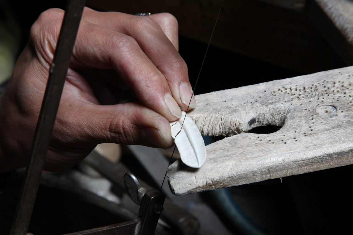 タガネを用いてフェザーの毛を1本1本スピーディかつ丁寧に彫っていく。フェザーの完成度を左右する重要な部分。職人技が如何なく発揮される。