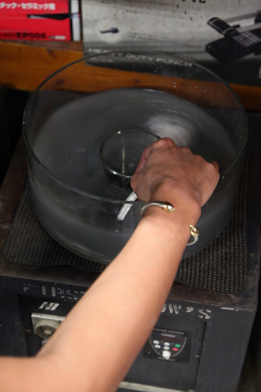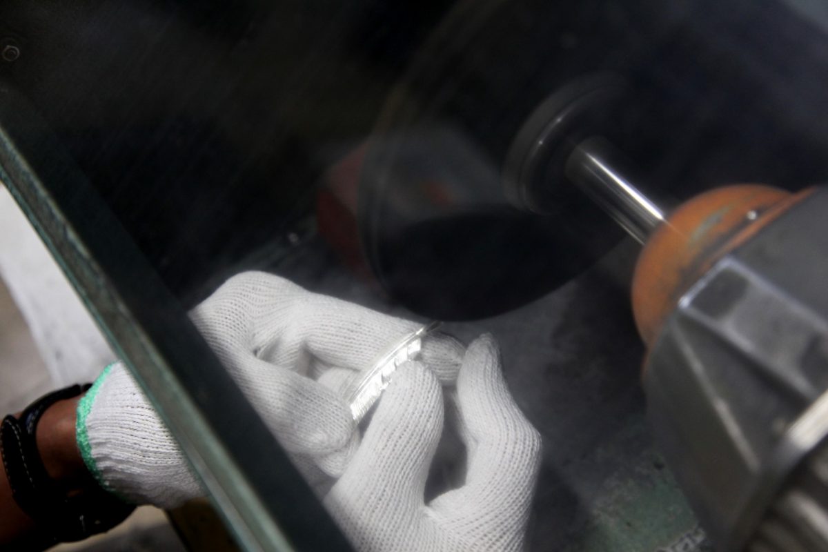 次は最終仕上げの「バフ掛け」の工程。高速回転するフェルト製のバフに当てることで、シルバー特有のピカピカな光沢が現れる。