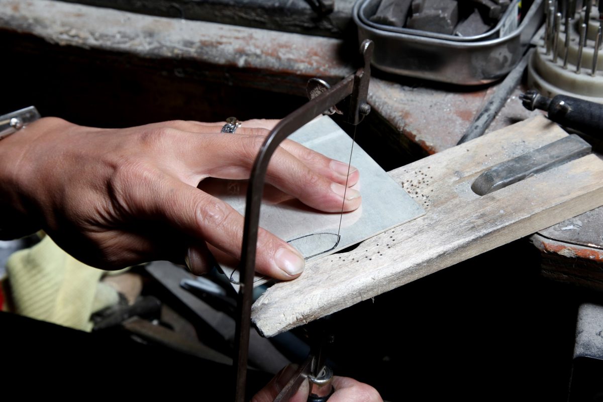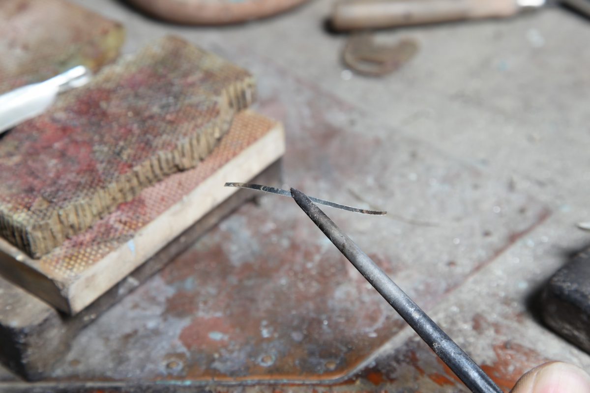 シルバーに描いた線に沿って、糸ノコで切っていく。驚きなのはそのスピードと正確さ。あっという間に、フェザー(の原型)が出来上がった。