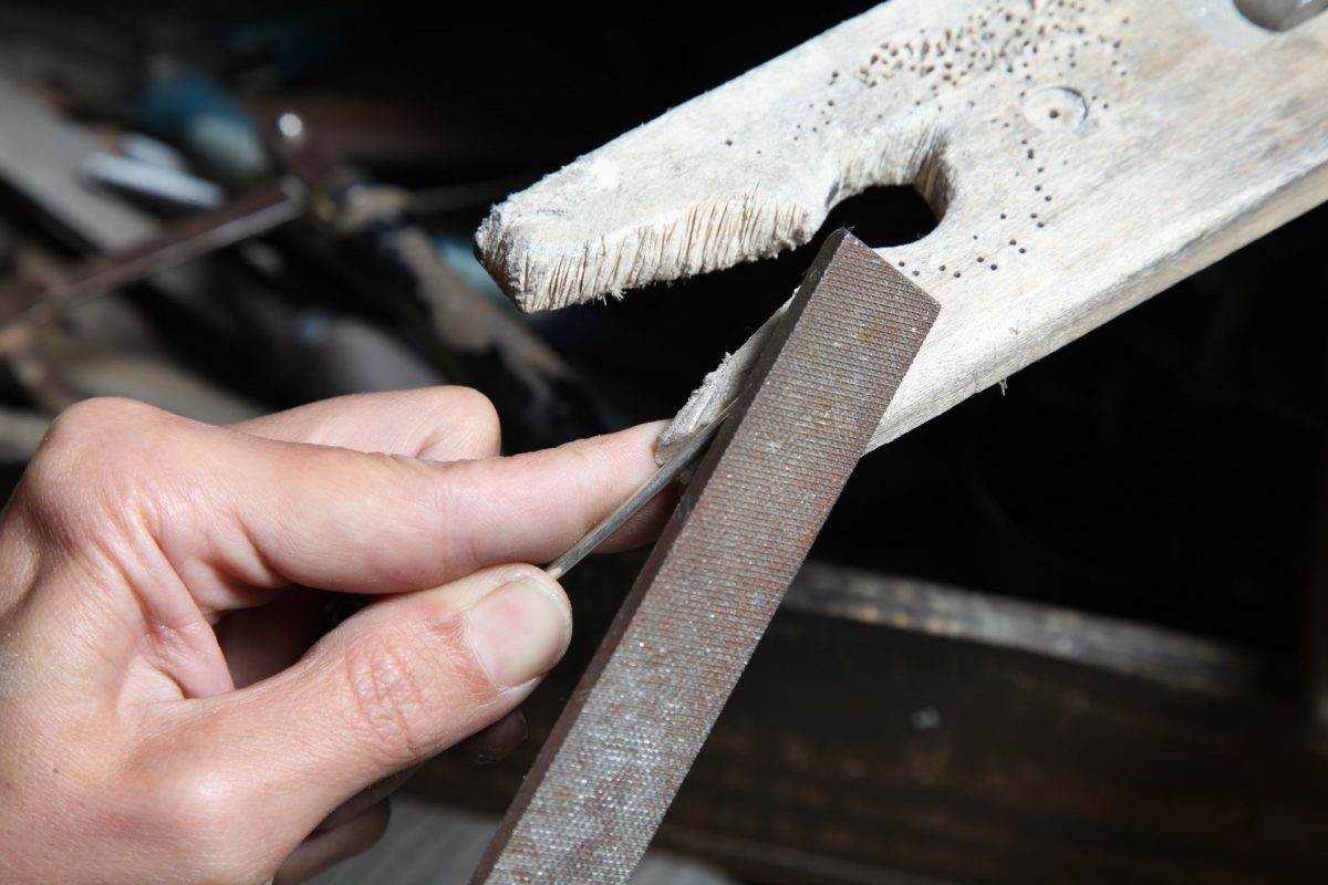 シャフトとなるシルバーの丸線の先端をヤスリで削り、尖らせていく。ここまでの所要時間、わずか数分!