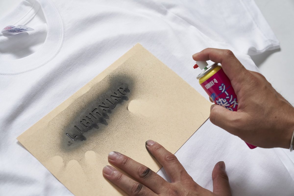 ステンシルの吹き方は極めて簡単。ステンシルマシンで作成したボードにスプレーを使ってシュッと吹くだけで完成する。ただしボードとTシャツの間に隙間があると文字がボヤけしまうため注意しよう! Tシャツの中にサンドペーパーを入れて動かないようにしよう。