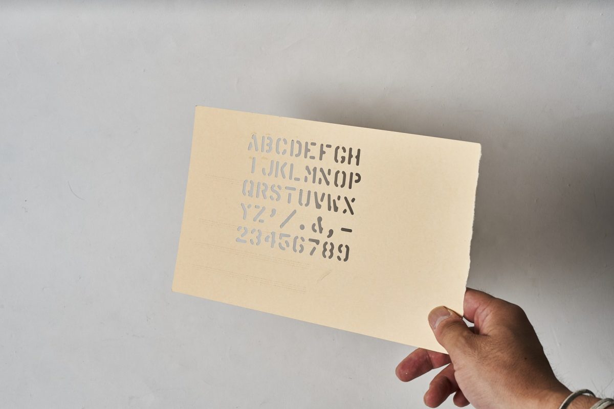 ステンシルマシンで打てる文字を羅列しただけでも、オシャレな雰囲気に。ちなみに1と0が存在しないのは無いのはアルファベットのIとOで代用できるから。合理的。