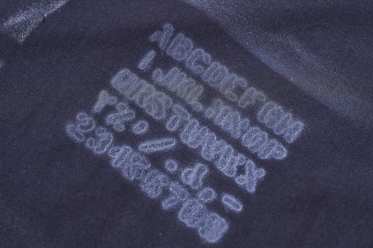 こちらも失敗例。濃色のTシャツに白い文字を入れようとしたが塗料のノリが悪く滲んだ。まずは見えない部分でテストすべし。