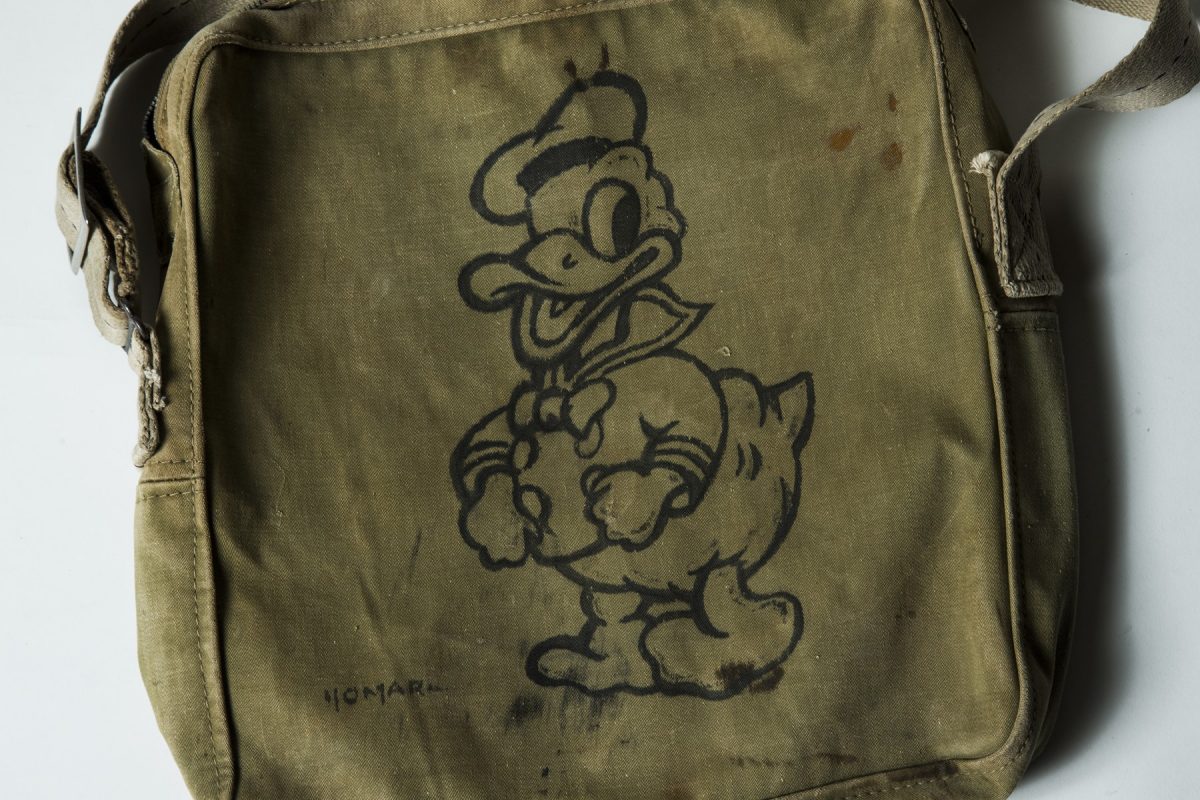 パラシュート用のストラップにステンシルを施し、それをバッグに縫い付けたカスタムショルダーバッグ。背面には有名なアヒルのキャラクターが描かれている。