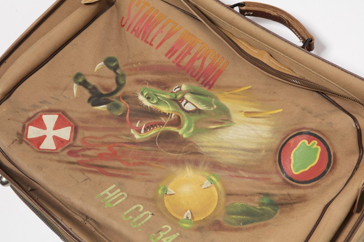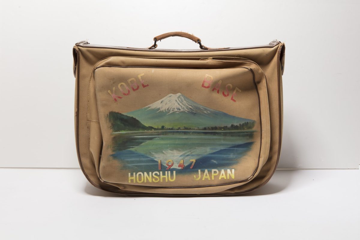 美しい富士山の風景が精緻に描かれたガーメントバッグ。実はこれ、戦後間もない頃の進駐軍が使用していた。背面にはオリエンタルを感じさせる竜が鎮座する。