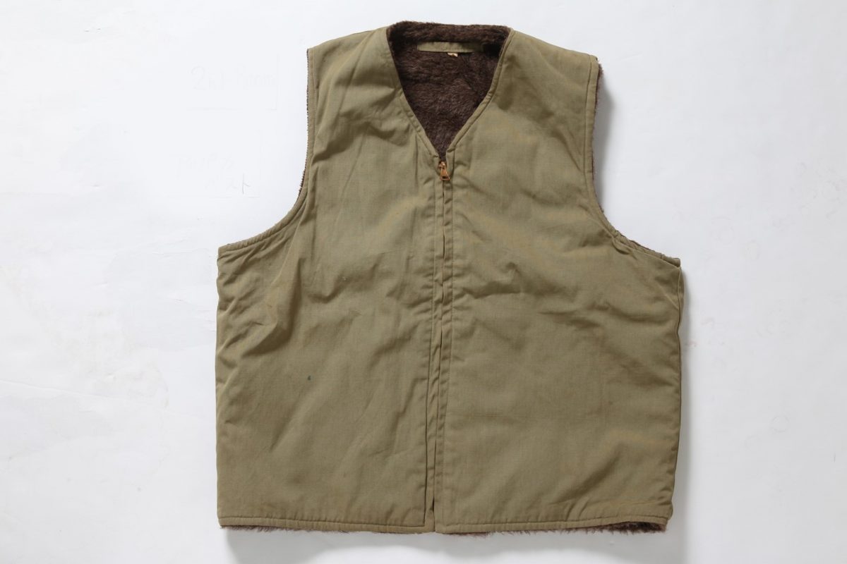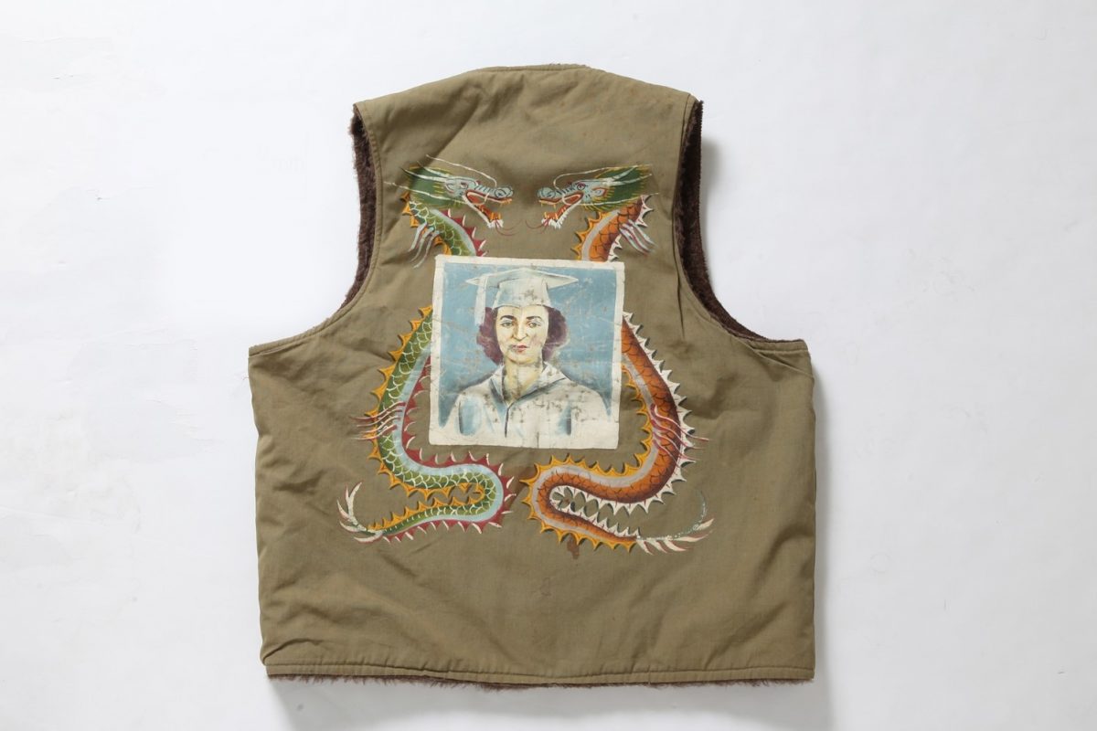 1940年代製のアルパカベスト。写真をそのままペイントしたような、リアルな女性が描かれ、横にはドラゴン。この組み合わせの妙が、なんとも気になる。